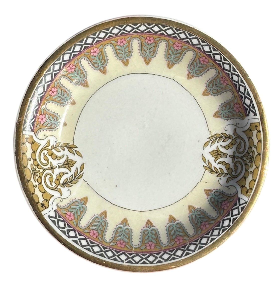 It has a raised gold detail on a cream colored body. It has a multicolored border of green, pink, gold, black and white.