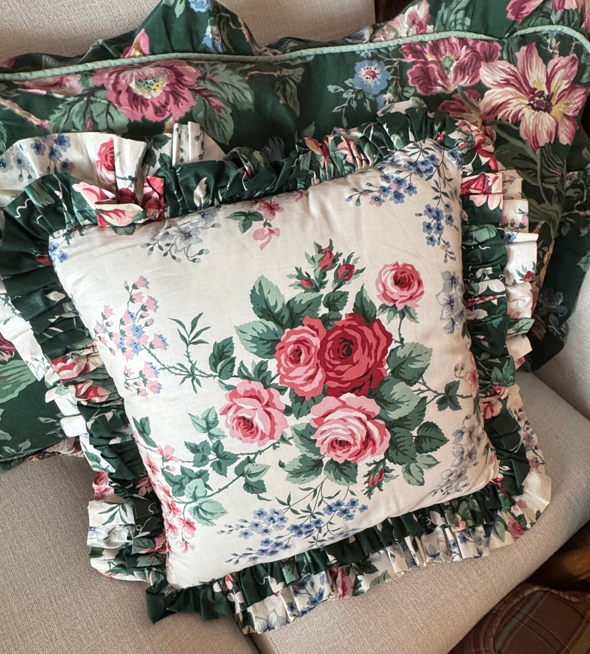 Custom Designer Pillow Reversible Ruffled Green Pink Chintz English Country Flowers Green & Pink Roses