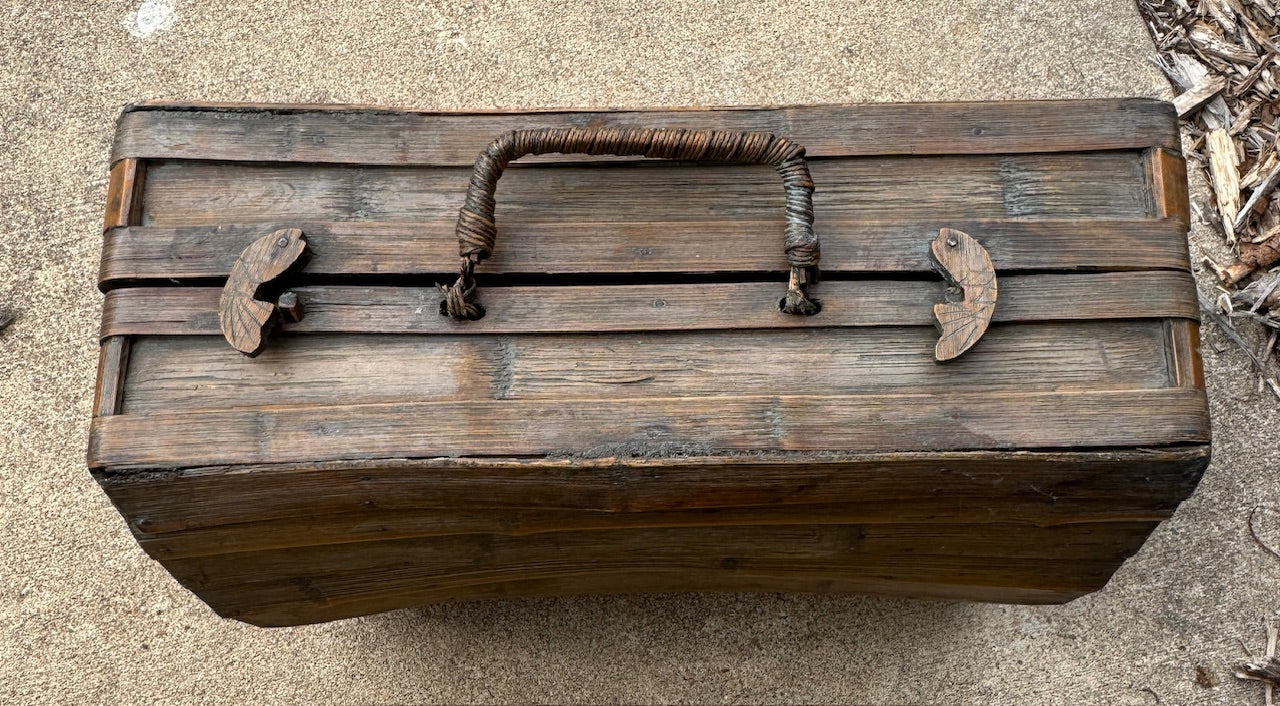 Vintage Barrel Sided Bamboo Slatted Wood Carrying Case / Suitcase w/ Carved Fish Latches Antique