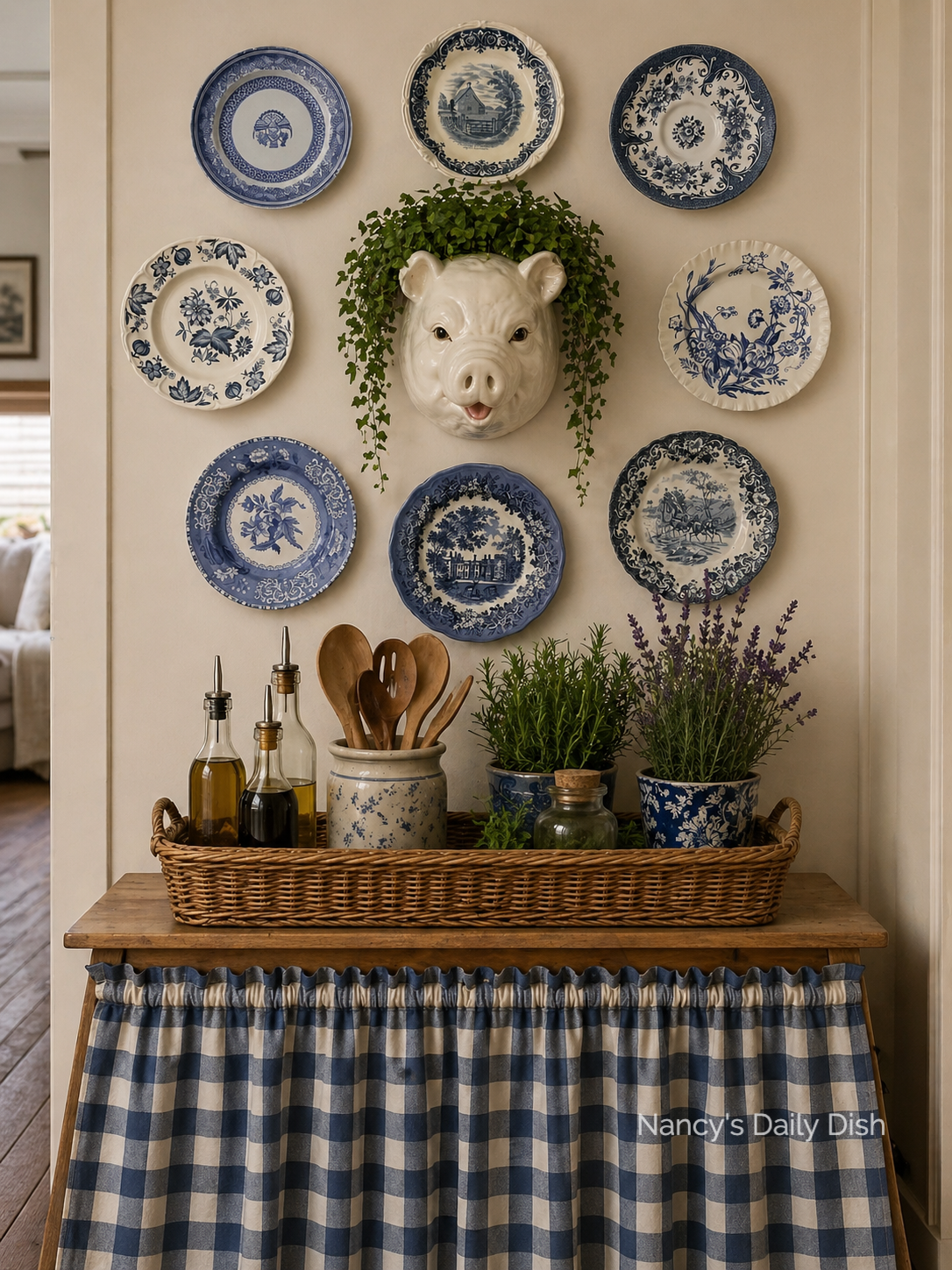 Perfect for your French or English country or farmhouse kitchen!  This pig head head has a hollow area for a plant, utensils, etc.  Looks great with nothing in it.  It is painted gray, black and shades of white in realistic detail.  This would be great as a dish towel holder, over your stove or a piece of art.  Has hole for hanging.