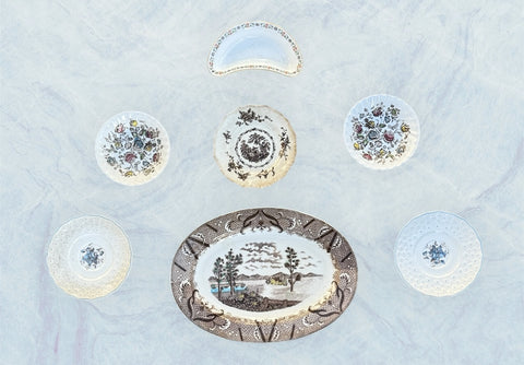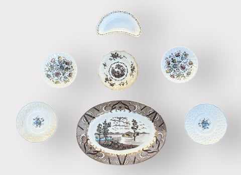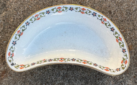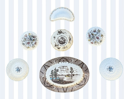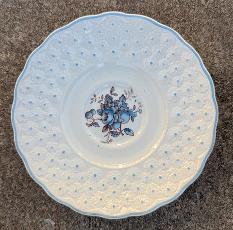 This lovely creamware plate was made by Wedgwood and features a brown transfer printed basket filled with flowers. The flowers and leaves are hand painted in pink, yellow and green shades. It has a raised border of acanthus leaf garland and flowers. They are just beautiful...perfect for Spring and Summer. I used them for an Easter table setting.