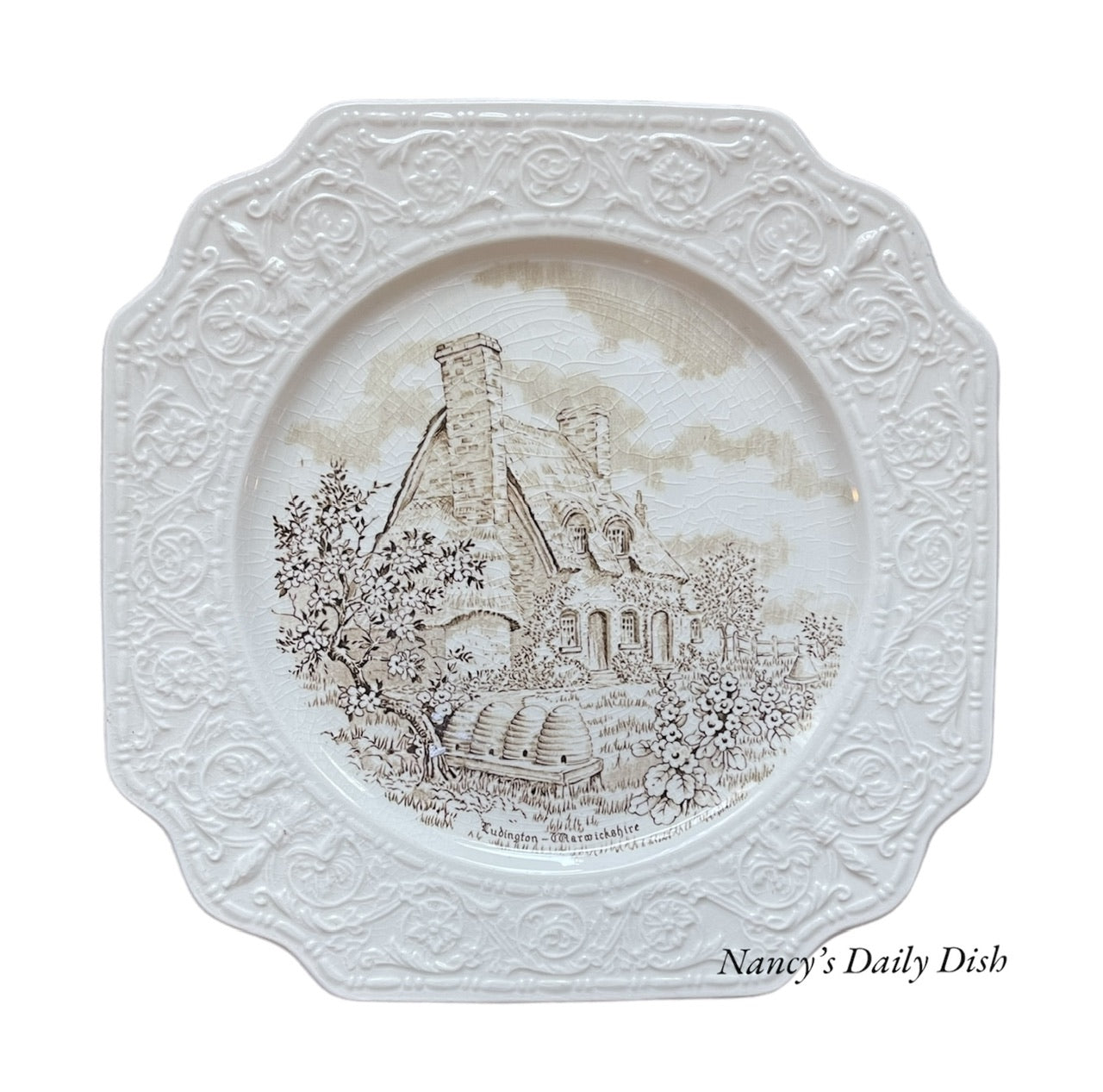 Brown Transferware Square Plate Bee Skep Plate Thatched Cottage English Garden