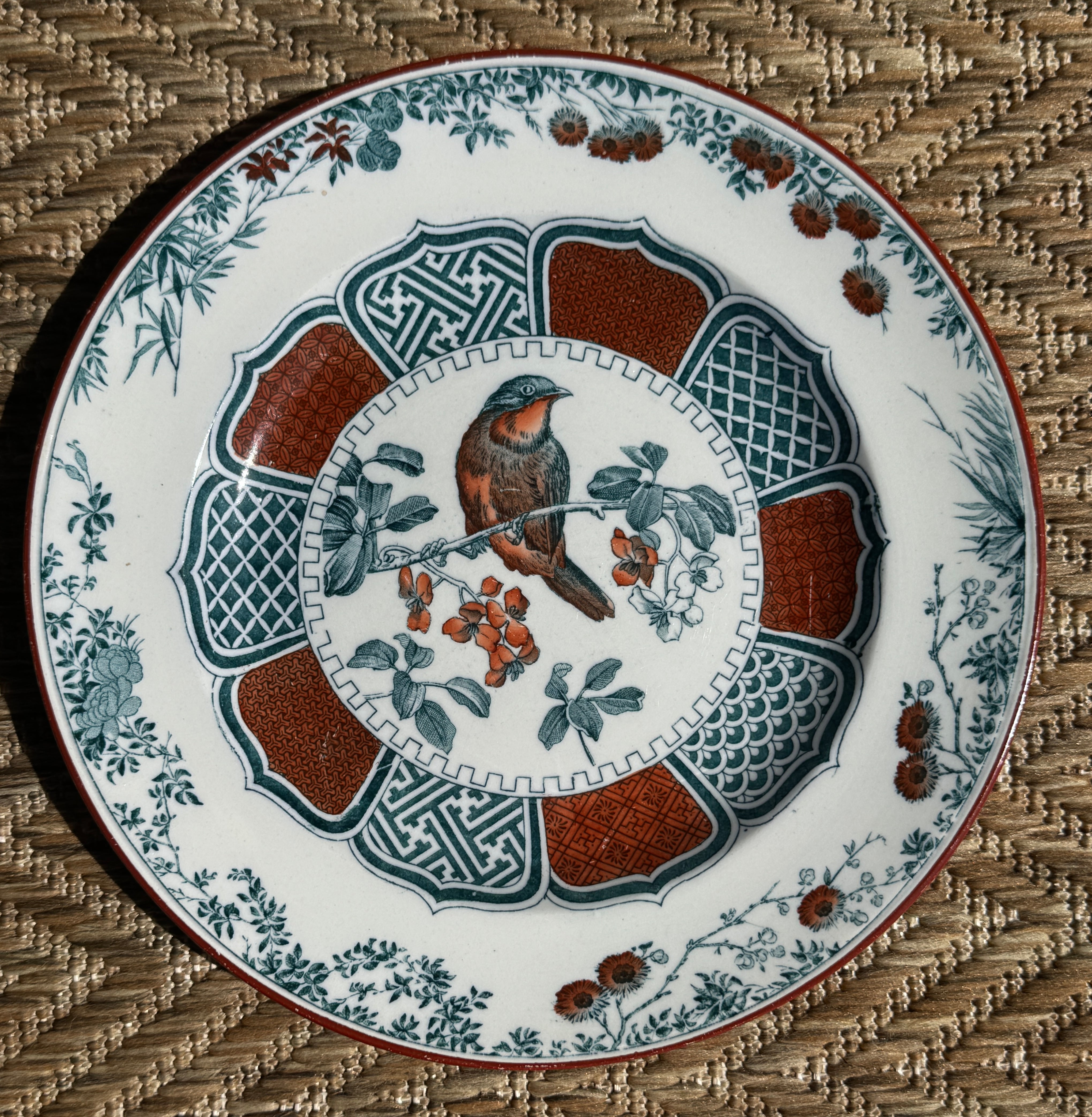 Here is an elegant, late 1800’s antique Wedgwood transferware plate featuring a beautifully detailed bird perched on a flowering branch at the center. The design is rendered in a striking combination of deep blue- green and painted rich rust-red tones, framed by an intricate geometric medallion border with alternating lattice and patterned panels.