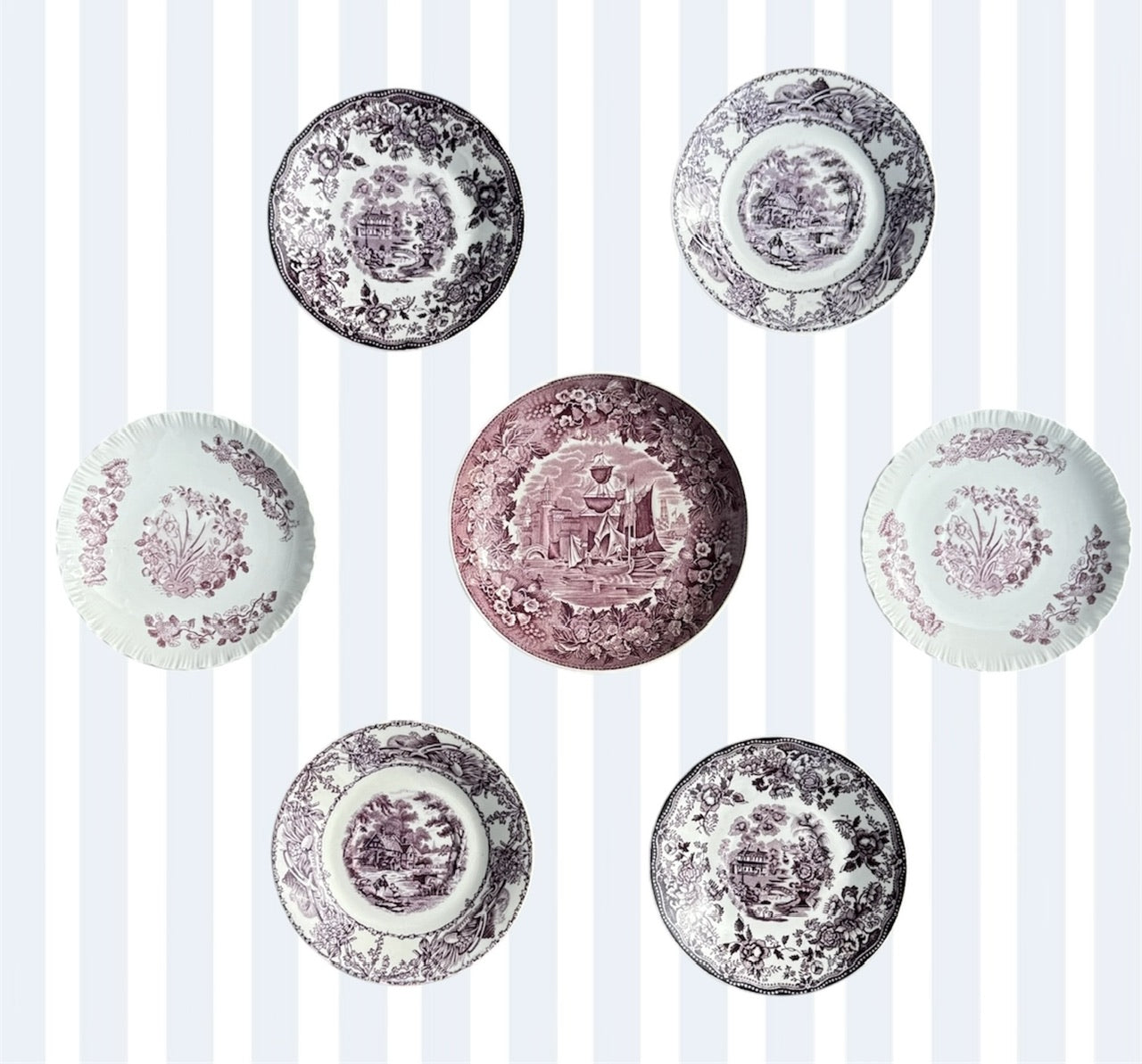 Set of 7 Mix n Match Vintage English Purple Transferware Plates Instant Wall Display