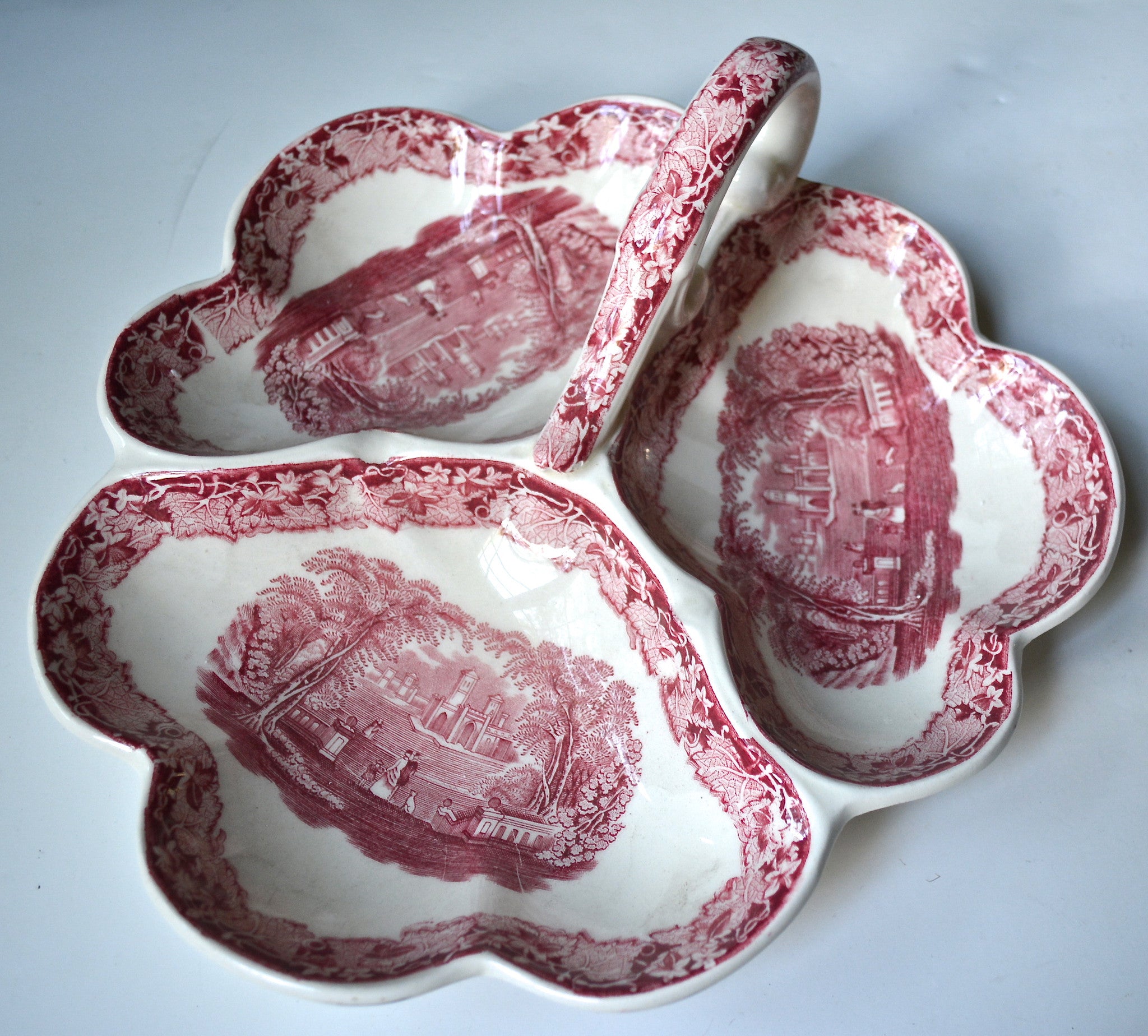 VINTAGE RED / PINK TRANSFERWARE ENGLISH TREFOIL DISH