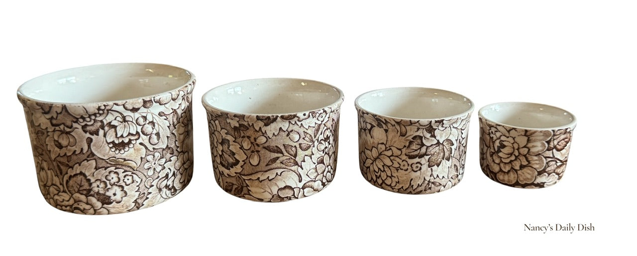 Set of 4 Brown English Ironstone Floral Chintz Transferware Nesting Measuring Bowls w/ Flowers- Cottage Kitchen