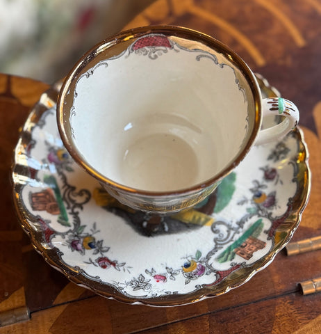 I have always loved this pattern by Spode / Copeland called May. The plater features a beautiful, unique pointed and scalloped edge. The black transfer border on the plate is of scrolls, feathers, flowers and fruits. A pretty scene depicts an Italian gondola river scene. Very rare to find in two colors! Truly stunning!