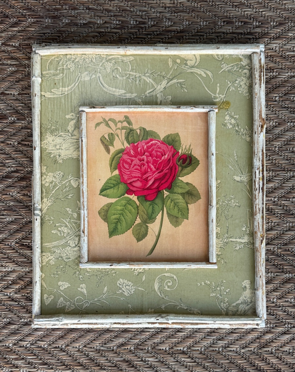 Vintage English Country Cabbage Rose 🌹 Print on Board w/ Green Toile & Distressed Bamboo Frame
